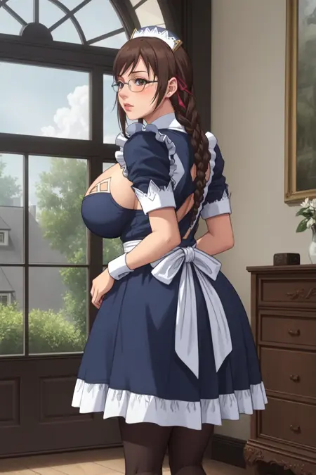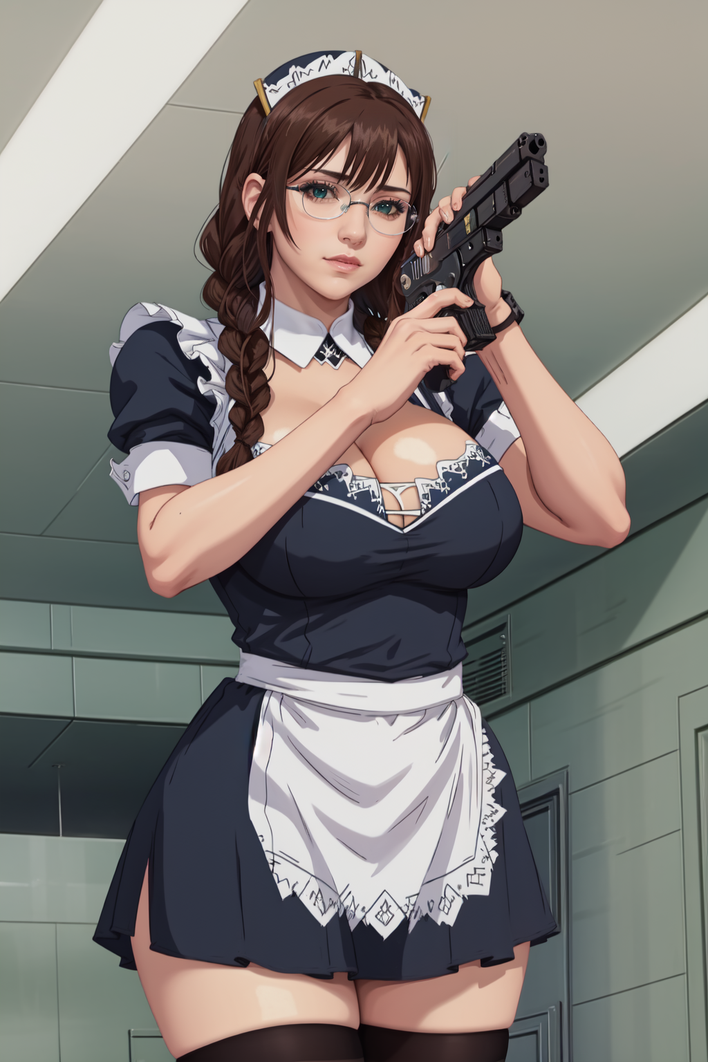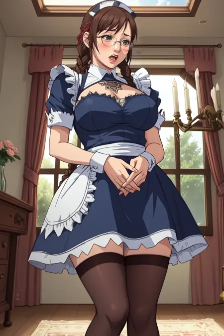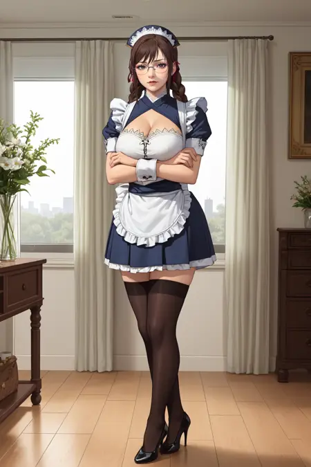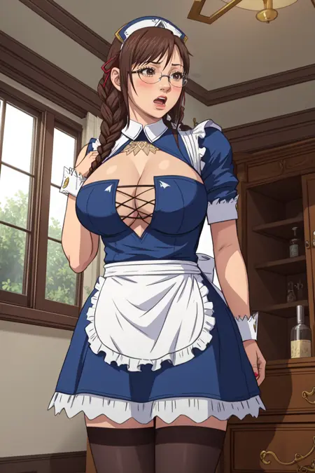메이드, 파란 드레스, 가슴 부분 절개, 단색 소매, 메이드 에프론, 주름치마, 검은 허벅지 스타킹, 흰 장갑, 하이힐