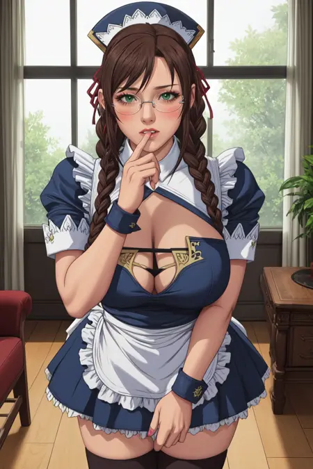 메이드, 파란 셔츠, 가슴 부분 절개, 단색 소매, 에프론, 미니스커트, 검은 허벅지 스타킹, 흰 장갑, 하이힐