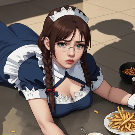 갈색 머리, 땋은 머리, 쌍 땋은 머리, 긴 머리, 녹색 눈, 안경, 헤어 리본, 메이드 헤어악세서리,