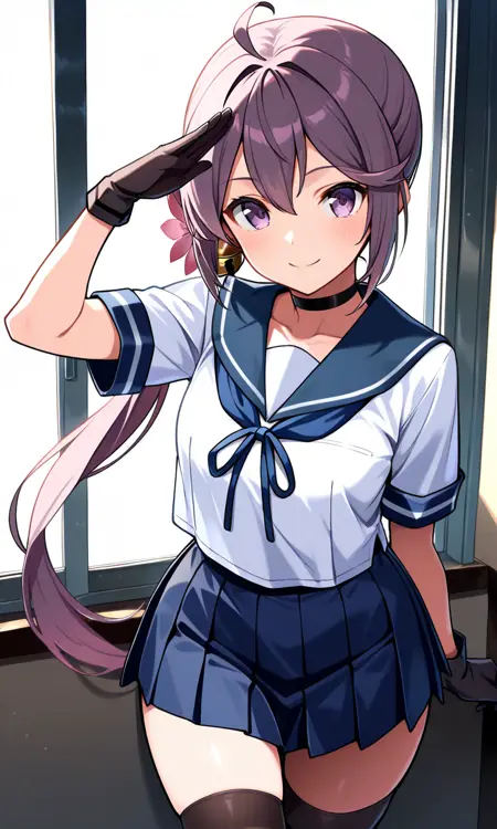 Kai ni服装: akebonoknKC,长发,裙子,发饰,呆毛,短袖,百褶裙,水手服,项圈,黑色手套,黑色过膝袜,发花,水手领,侧马尾,蓝色裙子,黑色项圈,蓝色水手领,发铃
