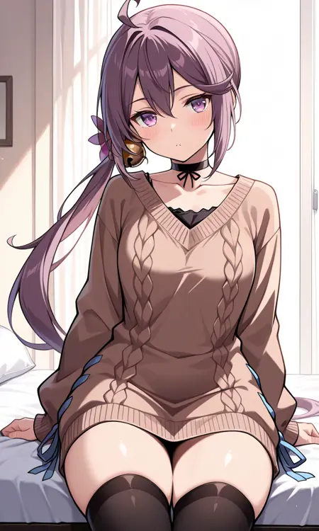 节分服装: akebonoknsbKC,长发,发饰,长袖,连衣裙,锁骨,呆毛,项圈,黑色过膝袜,发花,侧马尾,毛衣,发铃,棕色毛衣