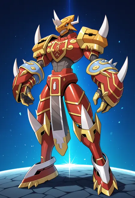 Trigger words: k41s3rgr3ym0n, blue eyes, digimon (creature), orange horned helmet, breastplate, gauntlets, pelvic curtain,