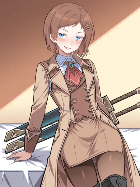 estydee, a11_bat, 棕色头发, 短发, 齐平发尾, 蓝眼睛, 发夹, 小胸, 领结, 吊坠, 白色翻领衬衫, 双排扣背心, 长外套, 棕色外套, 袖套, 背部剑鞘, 棕色铅笔裙, 连裤袜, 黑色及膝靴