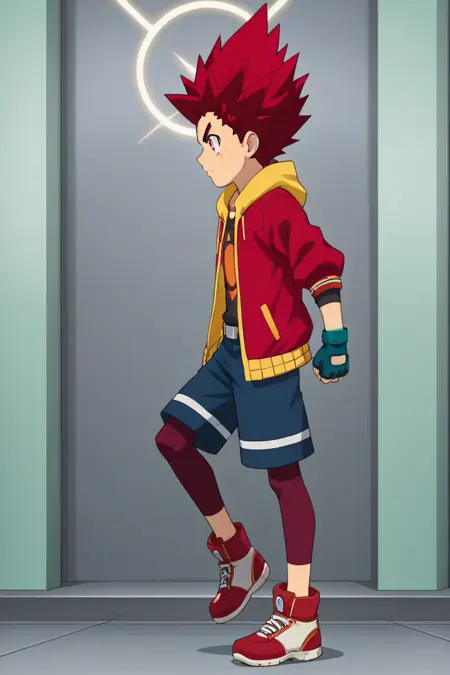 Outfit 1: male, red hair, spiked hair, red eyes, facial mark on left cheek, hoodie, black shirt, black print shirt, open clothes, single fingerless glove, one glove only, belt, blue shorts, compression leggings, shoes
