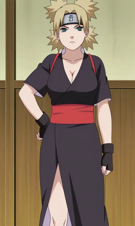 Temari,1girl,solo,blonde hair, short hair,green eyes,quad tails,black shirt, fishnet top, purple sash, black skirt, fishnet shorts, black gloves, fingerless gloves, black boots, toeless footwear