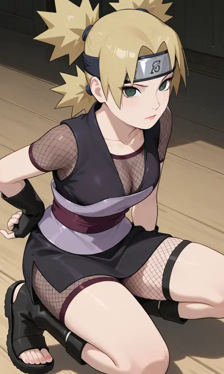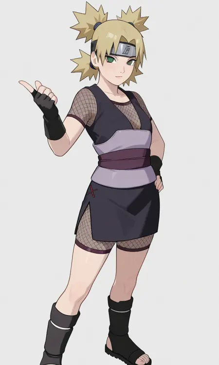 太郎,1个女孩,独奏,金发,短发,绿眼,四条尾巴,黑色上衣,渔网上衣,紫色腰带,黑色裙子,渔网短裤,黑色手套,露指手套,黑色靴子,露趾鞋