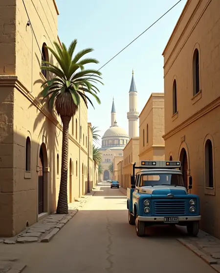 A narrow alley through an ancient stone city features worn cobblestones, moss-covered walls, and doors with Arabic or Mediterranean architectural elements. Ornate wooden doors, ivy-covered windows, and misty mountains in the background create a tranquil yet ancient urban space steeped in forgotten stories.