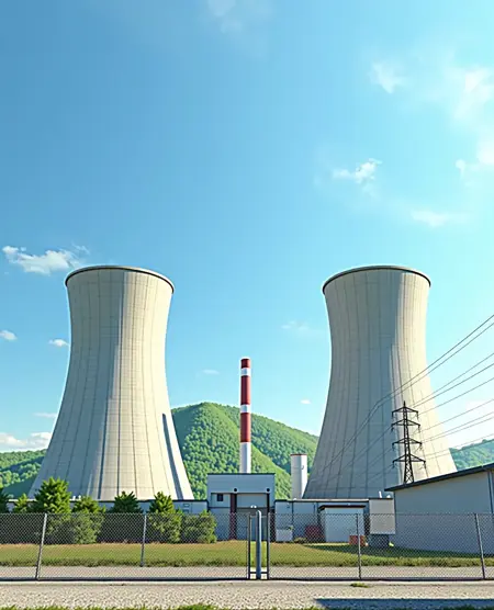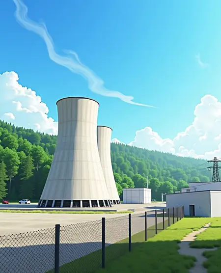 Nuke – Clean industrial layout, steel catwalks, blue/white buildings, radioactive signs