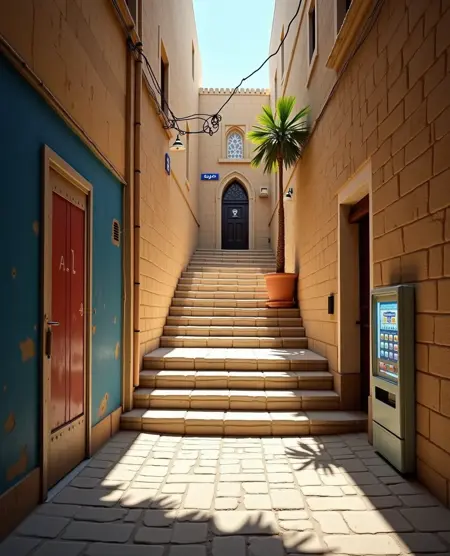 Steps rise through a worn-out neighborhood. Sunlight warms faded walls marked with graffiti. Above, the blue sky softens harsh edges. This alley could house both silence and fire.