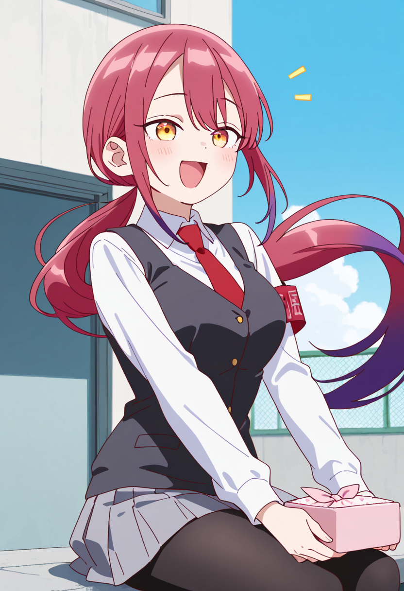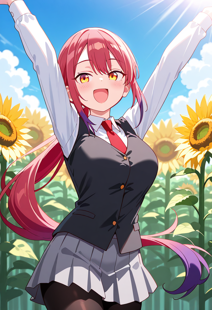 衣装プロンプト: 白いシャツ、赤いネクタイ、黒いベスト、長袖、カラーシャツ、腕輪、黒いパンティーストッキング