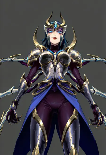 护甲,金色镶边,肩甲,尖锐指甲,爪形手套,臀部斗篷,裙甲,斗篷上有绳结