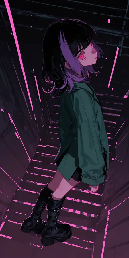 1girl, black hair, multicolored hair, purple hair, pink eyes, medium hair