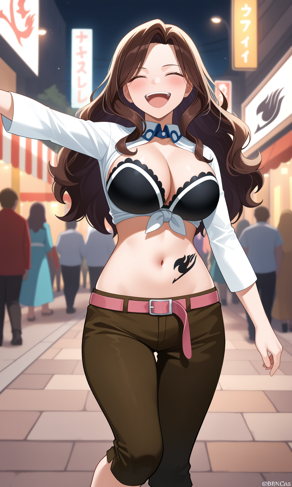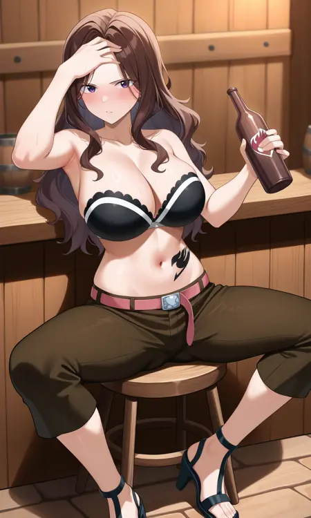 | トレーニングワード | c4n4brncas, purple eyes, brown hair, wavy hair, long hair, sidelocks, black bra, strapless bra, cleavage, tied shirt, open shirt, white shirt, collared shirt, long sleeves, bag, strap between breasts, navel, brown pants, pink belt, belt buckle, capri pants, strappy heels, sandalsコピーしました! stomach tattoo, black tattoo, fairy tail logo,コピーしました! |