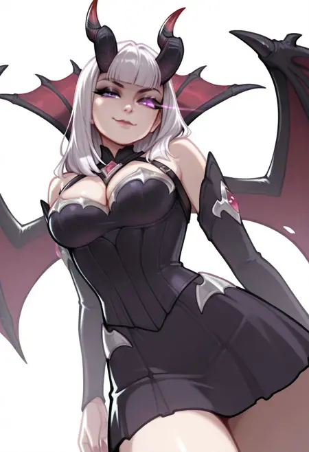 1girl, alice_mlbb, 恶魔女孩, 吸血鬼, 浅粉色头发, 长发, 直发, 齐刘海, 苍白皮肤, 紫色眼睛, 眼影, 口红, 角, 恶魔角, 红色尖端的角,