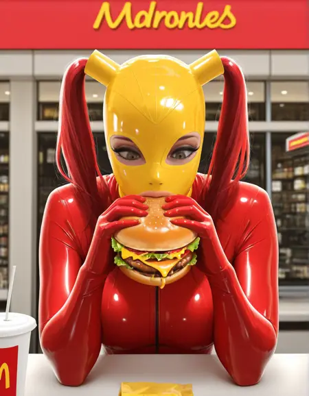 Flux is awesome just go wild with it. Even without using the hood the lora is great for improving the latex look in flux and giving the subject bigger busts. If you get hair in the images you can add "no hair" to the prompt to easily fix that.