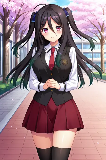 외모: 검은 머리, 그라데이션 머리, 녹색 머리, 긴 머리, 아호게, 눈 사이의 머리카락, 앞머리, 양쪽 올려매듭, 머리 리본, 파란 리본, 분홍색 눈