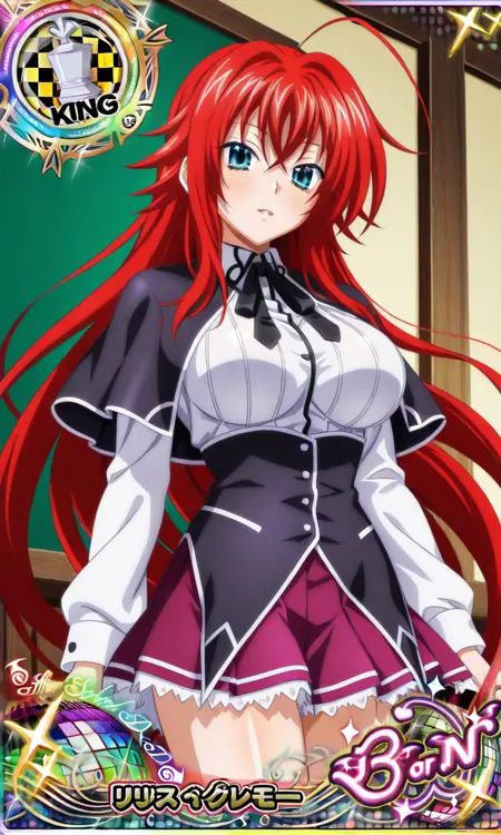 リアス・グレモリー、1人の女の子、青い目、赤い髪、長い髪、アホ毛、大きな胸、ホワイトのシャツ、ブルーのセーターのベスト、ブルーのネックリボン、ショートスリーブ、レッドのスカート、ブラックのタイツ