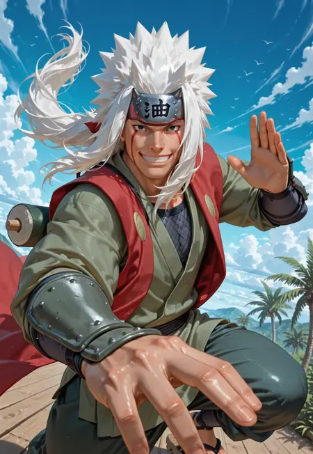 | 训练词汇 | 1boy, adult male, jiraiya (/Naruto)/, (ultra HD quality details), white hair, spiky hair, long hair, ponytail, red facial mark, (black eyes), strong jawline, sidelocks,已复制! forehead protector, symbol on forehead protector已复制! ninja outfit, shinobi, red sleeveless haori, green kimono, mesh armor, wide pants, wooden sandals, open front vest, arm guards,已复制! |
