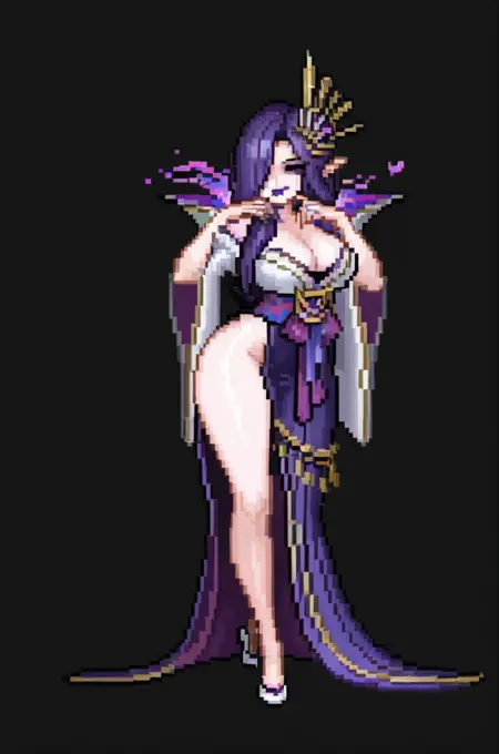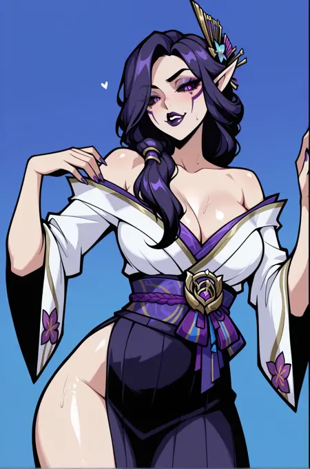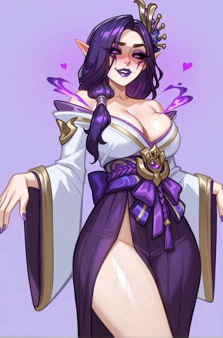 | 训练词汇 | SB_ Morgana, long purple hair, elf ears, purple eyes, black sclera, dark purple lips, violet face markings, open shoulders, violet nails, white kimono-style dress , gold trim, purple obi with bow,(long dark purple skirt), wide sleeves, floral hairpin已复制! |