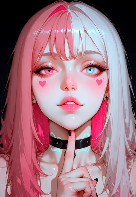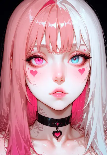 * 髪:鮮やかなツートンカラーで、半分は白、半分は鮮やかなピンク。真っ直ぐで、濃い前髪があります。 * **目:** 明確な異色瞳で、片方の目は紫色、もう片方は淡いアイスブルー。目は細めです。