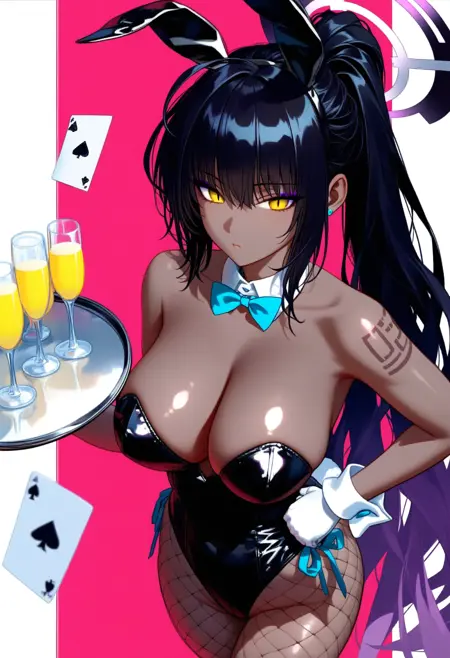 Wakamo (blue archive), a fox girl with black hair, yellow eyes and fox mask standing on the left wearing maid outfit. She holds tray with a unworn panties. Her expression is smug and confident, she proudly presenting the tray.
