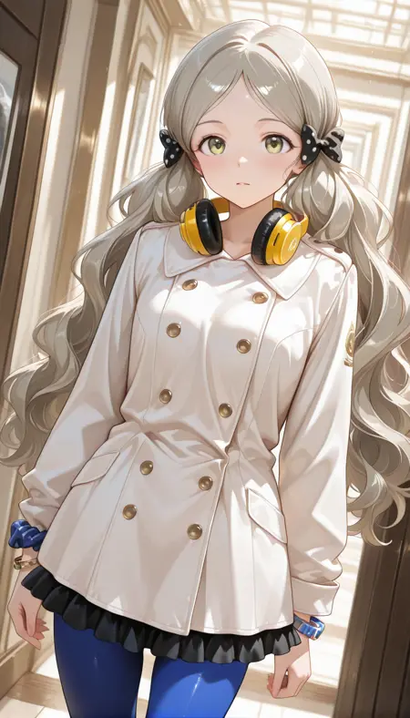 skirt, long sleeves, bow, ribbon, jewelry, jacket, hair bow, pantyhose, frills, black skirt, miniskirt, coat, bracelet, black bow, buttons, headphones, white jacket, scrunchie, frilled skirt, polka dot, white coat, double-breasted, wrist scrunchie, bangle, headphones around neck, polka dot bow, bead bracelet, blue pantyhose,