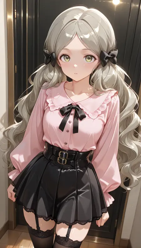 shirt, skirt, long sleeves, thighhighs, bow, ribbon, collarbone, hair bow, pleated skirt, frills, belt, black thighhighs, black skirt, miniskirt, black blue skirt, zettai ryouiki, black bow, neck ribbon, black ribbon, buttons, garter straps, puffy long sleeves, lace trim, buckle, corset, black belt, lace, mary janes, pink shirt, belt buckle, shirt tucked in, lace-trimmed legwear, jirai kei, black garter straps, lace-trimmed skirt, lace-trimmed thighhighs, thighs, puffy sleeves, fingernails, high-waist skirt,