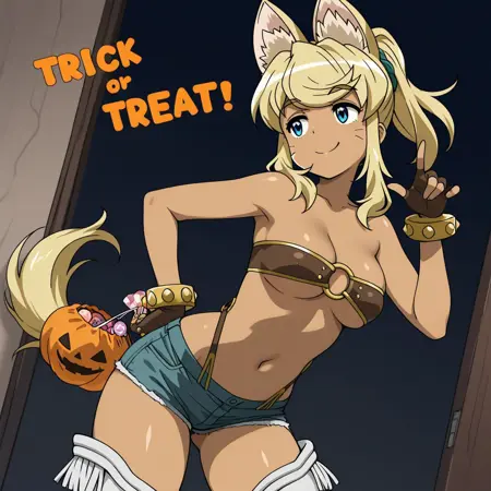 提示:莉露,深色皮肤,金发,马尾辫,蓝眼睛,狼耳,狼尾,胸罩式腰带,露指手套,手镯,牛仔短裤,过膝靴