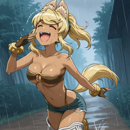 Prompts: Liru, dark skin, blonde hair, ponytail, blue eyes, wolf ears, wolf tail, belt bra, fingerless gloves, bracelet, denim shorts, thigh boots