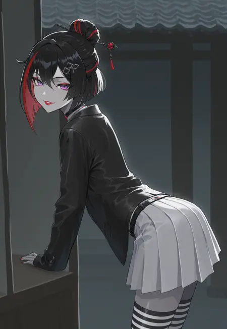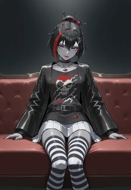 MiyakoF、灰色の肌、複色の髪、ストライプの髪、赤髪、黒髪、短髪、髪飾り、髪飾り(結び目)、紫の目、赤い唇、チョーカー、ネックレス、ジャケット、長袖、シャツ、ベルト、プリーツ入りの白いスカート、ストライプの太ももハイズ、靴、