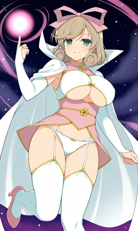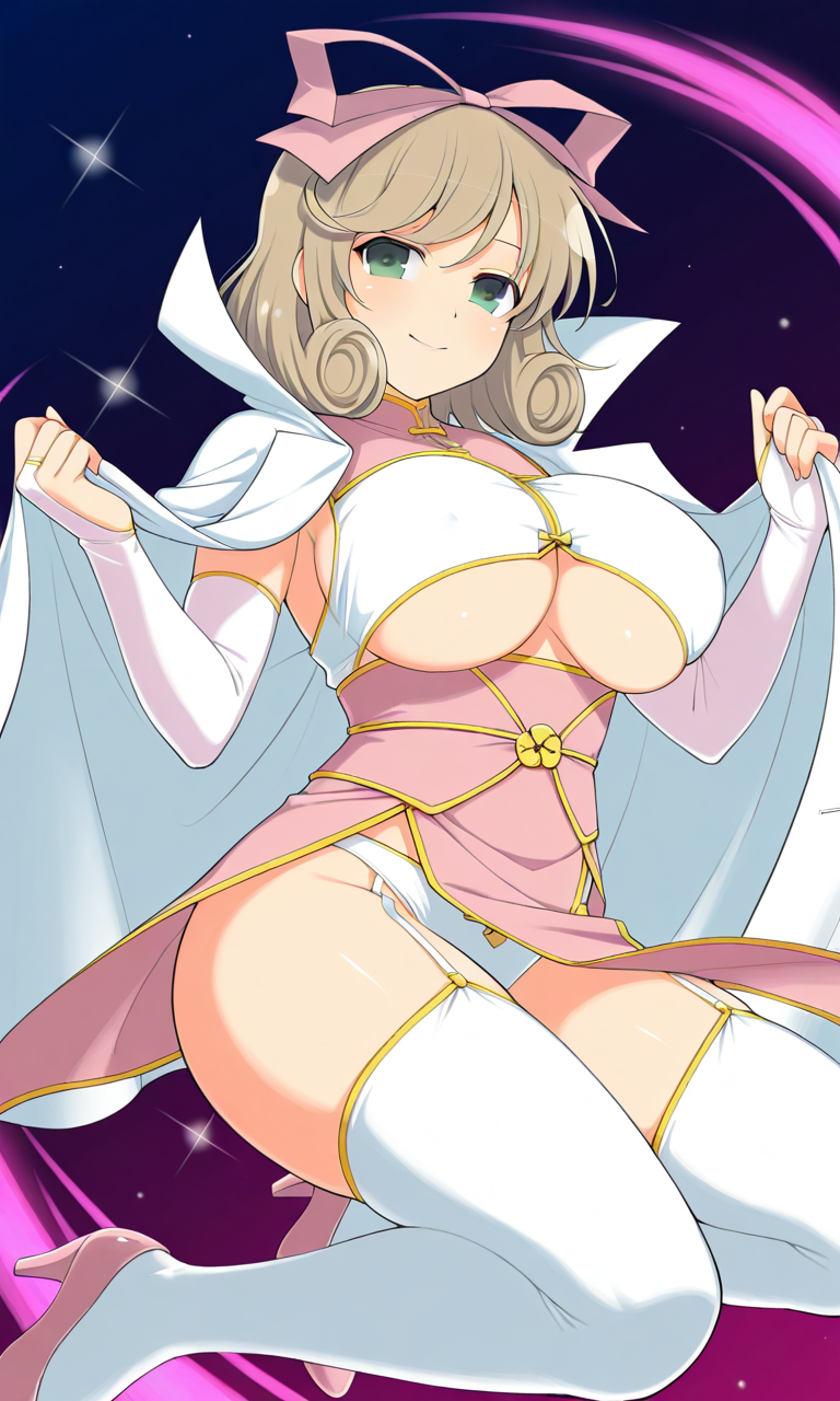 ハルカ(戦姫絶唱シンデレラ)、薄茶色の髪、短髪、ドリル髪、ヘアリボン、緑の目、大きな胸、太もも、shinobi_outfit、タイプ1、ガーター Strap、ラボコート、ケープ、白いレッグウェア、白いパンティ、ブライダルグローブ、アンダーブーブ、ピンクのコルセット、衣装カットアウト、ピンクのハイヒール