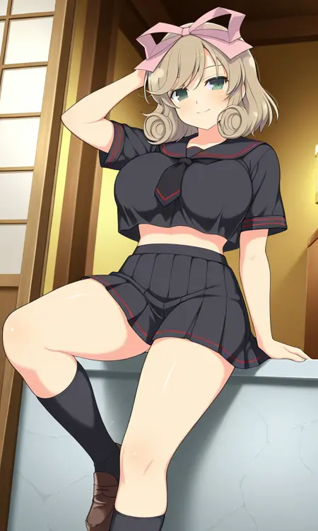 ハルカ(戦姫絶唱シンデレラ)、薄茶色の髪、短髪、ドリル髪、ヘアリボン、緑の目、大きな胸、太もも、hebijo_outfit、制服、黒いセーラー襟、黒いネクタイ、黒いセラフク、黒いシャツ、黒いスカート、プリーツスカート、クルップトップ、短い袖、黒いレッグウェア、茶色のローファー