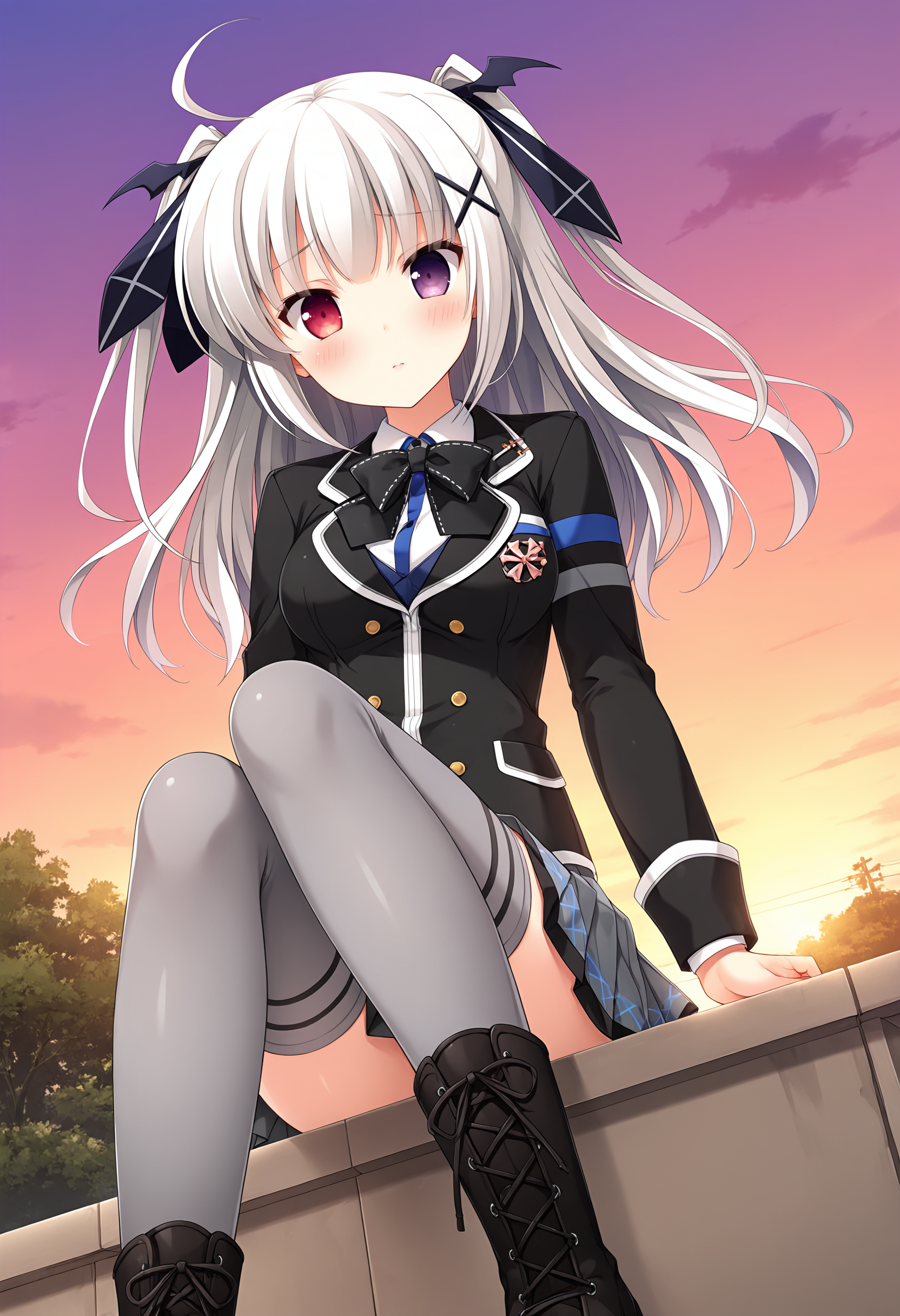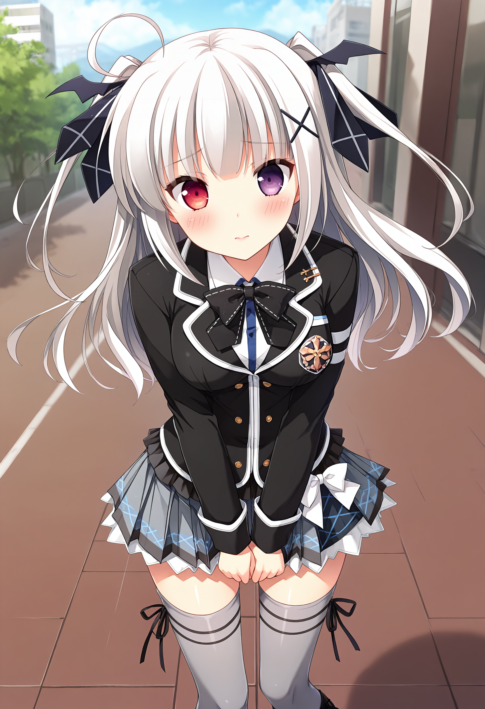 KANAE,XIAOFU,1girl,solo,ahoge,two side up,x hair ornament,hair ribbon,grey skirt,grey thighhighs,pleated skirt,black blazer,black bowtie,buttons,white bow,plaid,bow legwear,ribbon,