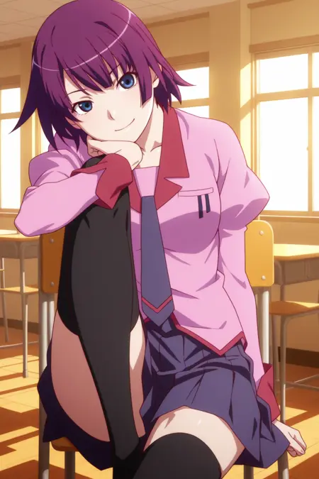 aahitagi, blue eyes, purple hair, hitagischool, pink shirt, puffy long sleeves, purple necktie, purple skirt, pleated skirt, black thighhighs, anime coloring,