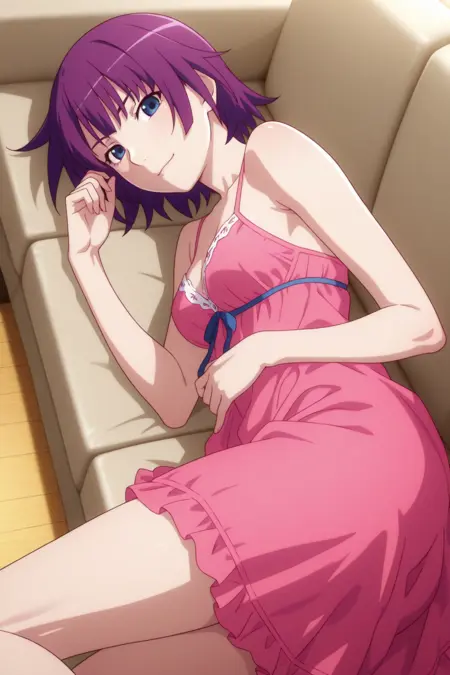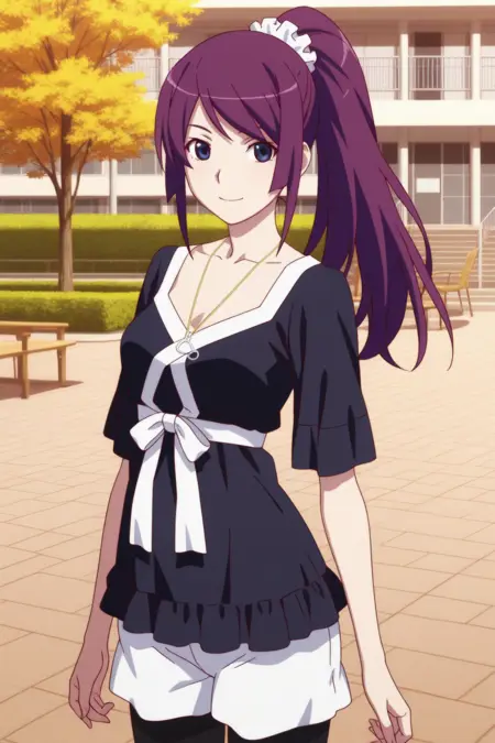 aahitagi, blue eyes, purple hair, ponytail, white scrunchie, hitagic1, necklace, (black shirt), short sleeves, white ribbon, white bow, white shorts, black pantyhose, anime coloring,
