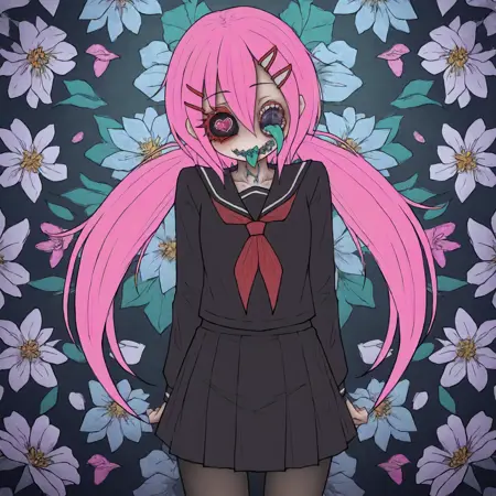 anime coloring, naughty\(ray-k\),1girl,monster girl,pink hair,low twintails,hairclip,eye mouth,eye tongue out,