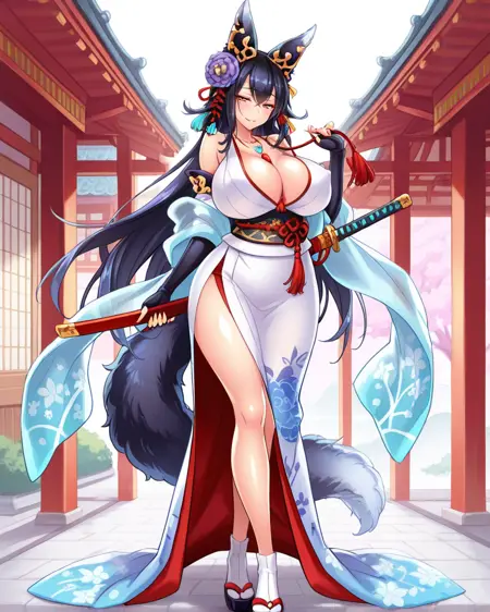 黄色い目、茶色い目、長い髪、黒い髪、青い髪、目の間の髪、髪の飾り、動物の耳、非常に長い髪、大きな胸、キツネの耳、輝く肌、大きな胸