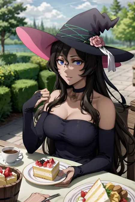 _Witch Hat및_Hat Flower를 제거하면 Viola를 모자 없이 생성할 수 있습니다._black cloak를 추가하면 Alyssa를 검은 외투 착용 상태로 생성할 수 있으며, 전신 생성 시_knee boots,_brown footwear도 사용할 수 있습니다.