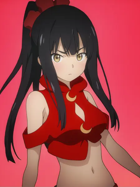 pantyhose,midriff,hair ornament,clothing cutout,skirt,bare shoulders,brown pantyhose,red single fingerless glove,crescent pin,crop top,red crop top