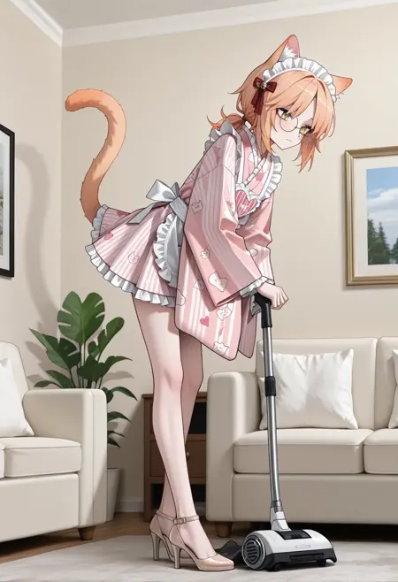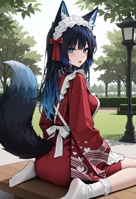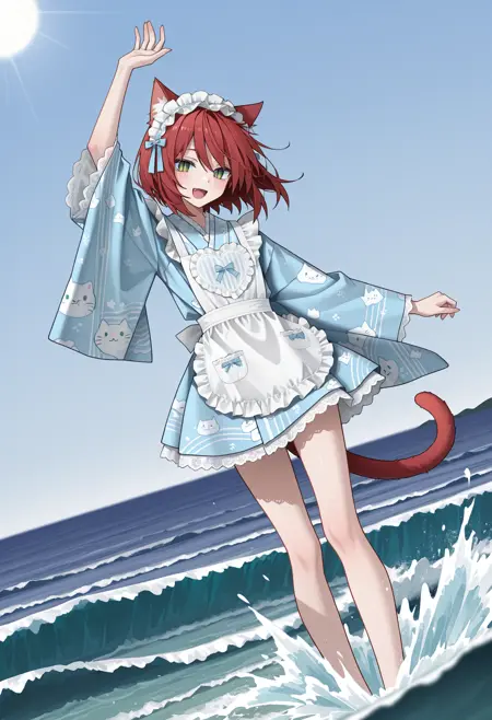 트리거 단어: amybentonmaid12, 일본 복장, 기모노, 프린트 기모노, 단기 기모노, 동물 및 스트립 프린트, 흰색 앞치마, 레이스, 프릴, 앞치마에 하트 프린트, 머리 장식,