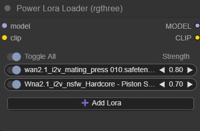 描述: 我的Mating_press是一个3D双性角色。对于偏好重口味内容的用户,将其与Wna2.1_i2v_nsfw_Hardcore搭配使用效果绝佳。它非常灵活,可与多种设置混合使用。我常用的参数组合如下: