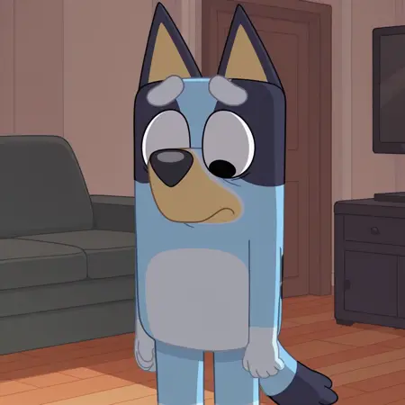 female, furry female, anthro, solo, young, dog, rectangular-shaped body, blue fur, two-tone fur, black eyes, eyebrows, black nose, tan muzzle, pointed ears, 3 spots on back, dipstick tail, short