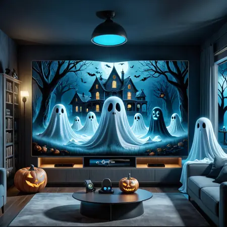 - 描述:将现代科技美学与万圣节的幽灵痕迹融合,呈现一个 AI 幽灵潜伏于明日设备中的未来世界。