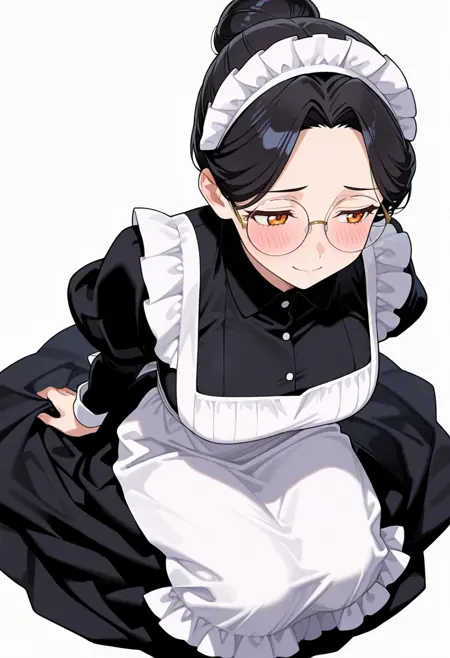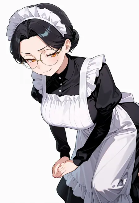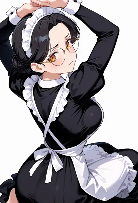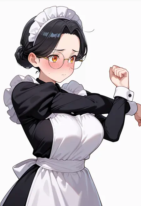 mailen_cnr, 1girl,black hair,single hair bun, bangs,orange eyes,round eyewear,large breasts,
