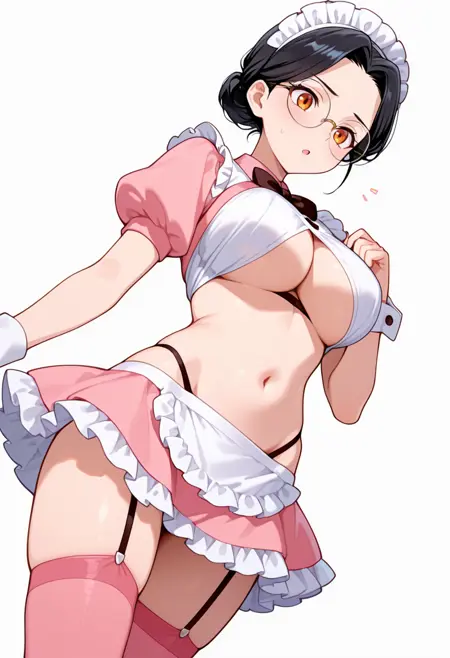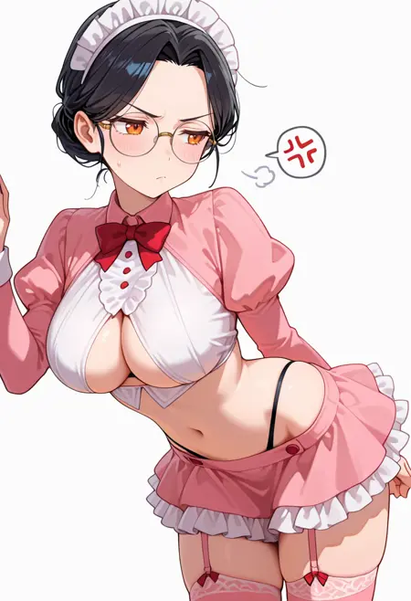 underboob,midriff,groin,maid headdress,bowtie,pink frilled shirt,pink frilled skirt,pink thighhighs,garter straps,highleg panties,string panties,puffy sleeves,