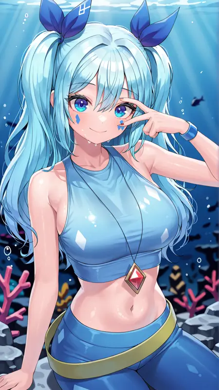 <lora:narin:0.8> narin, blue eyes, blue hair, long hair, twintails, bangs, hair between eyes, facial mark, jewelry necklace, hair ribbon, midriff, bare shoulders, blue shirt, croptop, yellow belt, blue pants, middle breasts