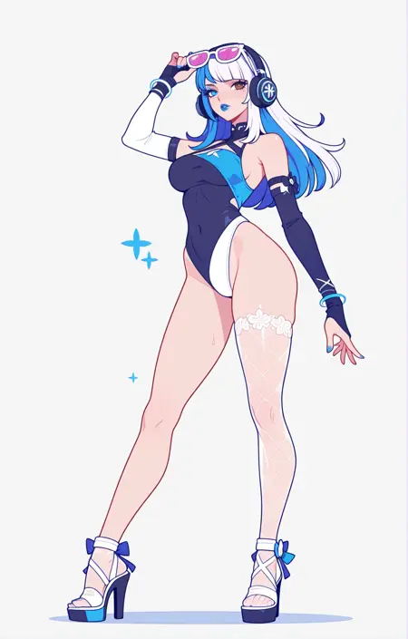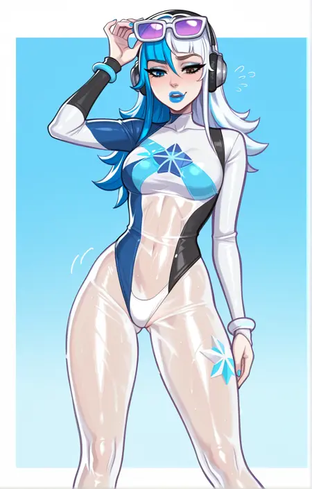 | トレーニングワード | Luna Snow CS,fair skin,slim body,long legs,heterochromia,blue eye,brown eye,white hair, straight hair,blue streaks in hair, headphones, sunglasses on head, blue makeup, blue lips, blue and white swimsuit, transparent bodysuit, white panties,barefootコピーしました! |