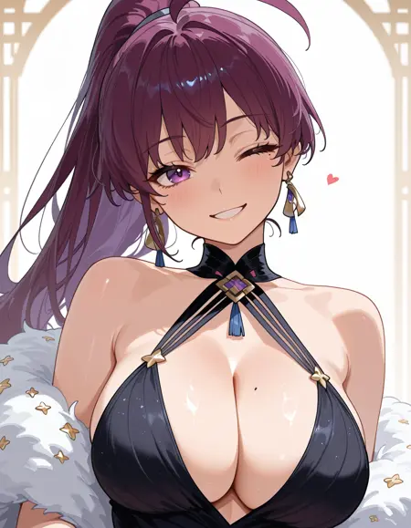 For best results, include at least these key tags:1girl, solo, long hair, purple eyes, collarbone, purple hair, sidelocks