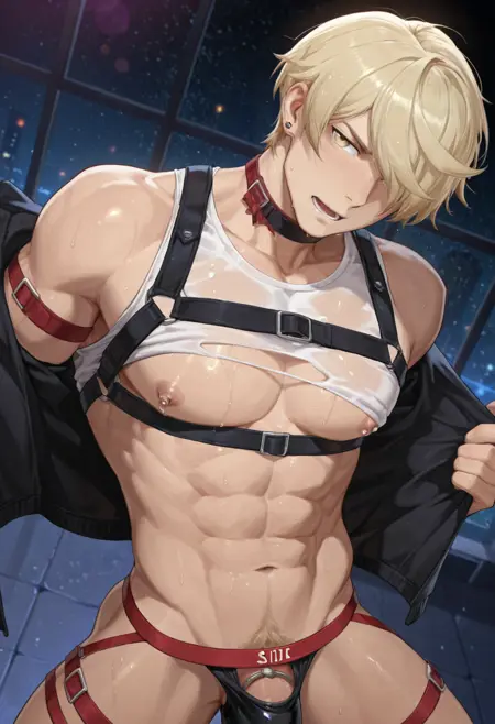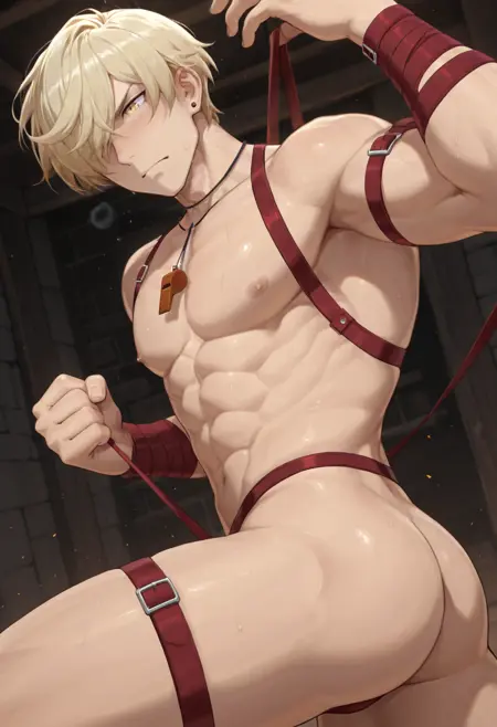 SezES, SezES_light_blonde_hair, SezES_yellow_eyes, SezES_sunglasses_on_head, SezES_whistle_necklace, SezES_lifeguard_band, SezES_wrapped_hand, SezES_tattoo_arm, SezES_tattoo_chest, SezES_black_swim_leggings, surfboard