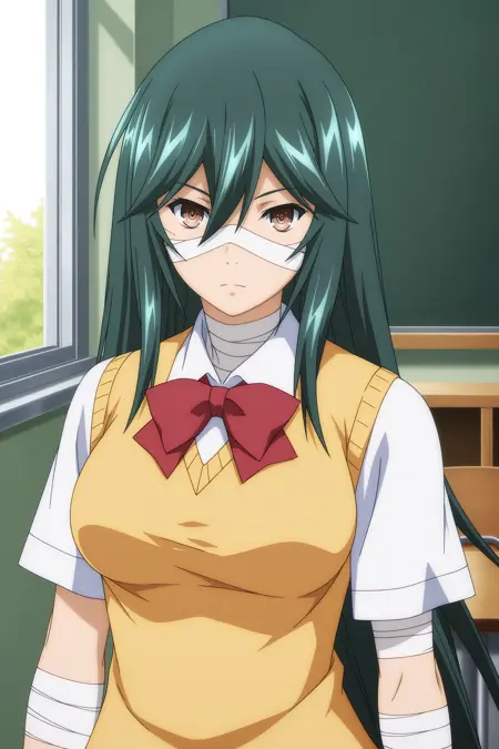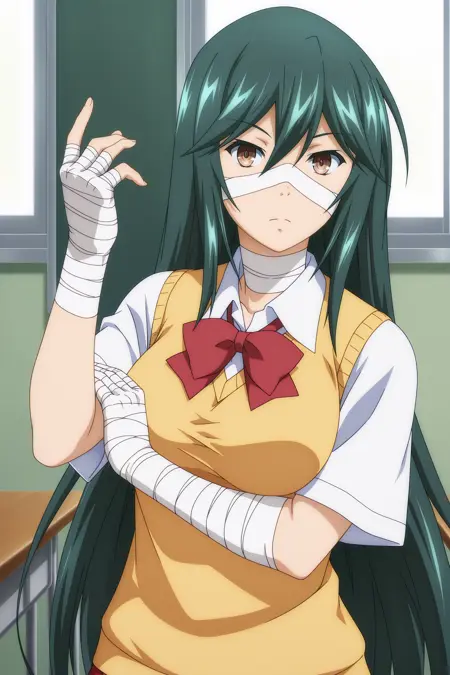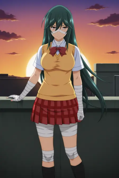 roshuku shikei, long hair, green hair, sidelocks, wispy bangs, brown eyes, bandage on face, short sleeves, white shirt, collared shirt, yellow vest, red bowtie, red skirt, pleated skirt, bandaged arm, bandaged hand, bandaged neck, bandaged leg, bandaged knees, black socks, kneehighs, brown footwear, loafers